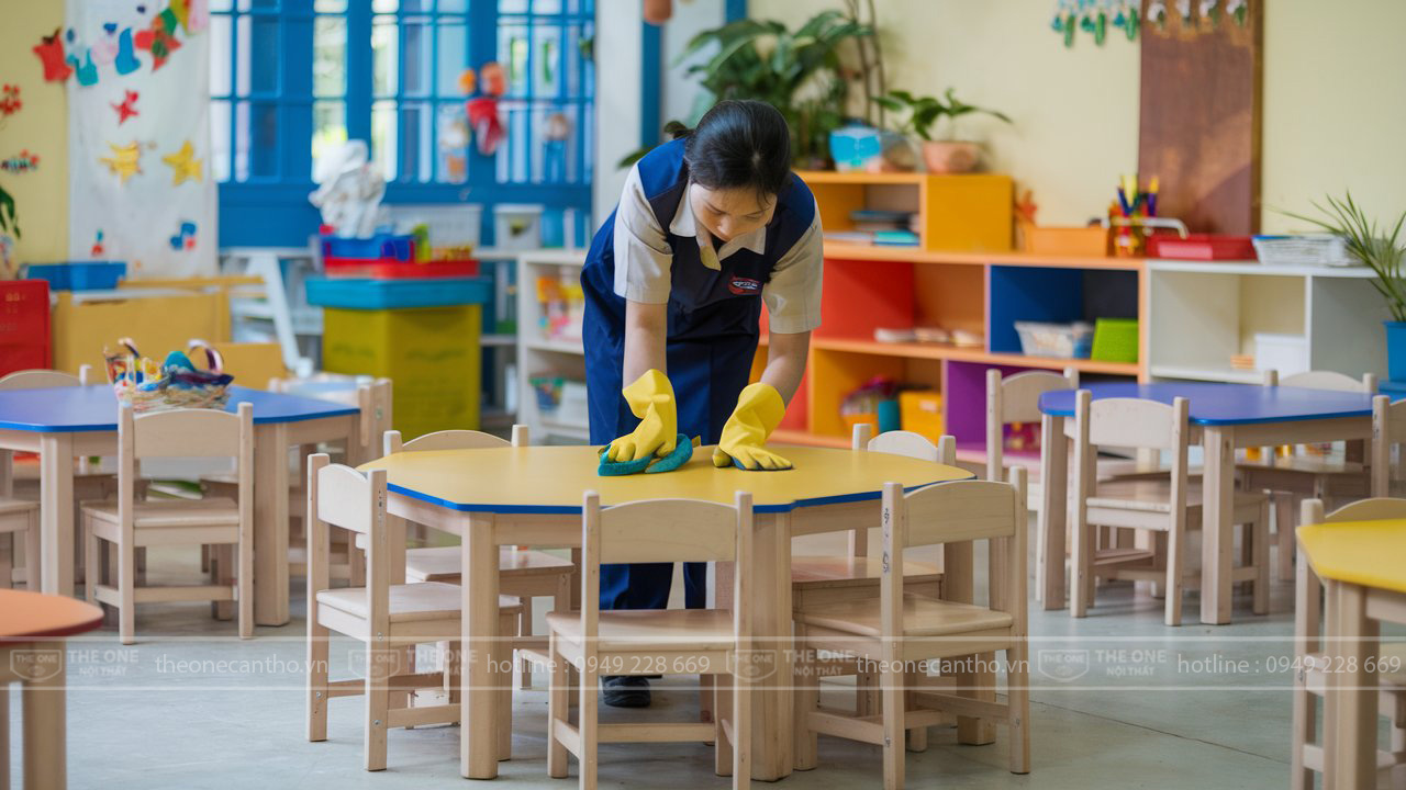 Bàn ghế mầm non được vệ sinh thường xuyên giúp khử khuẩn, đồng thời kéo dài tuổi tho của sản phẩm.