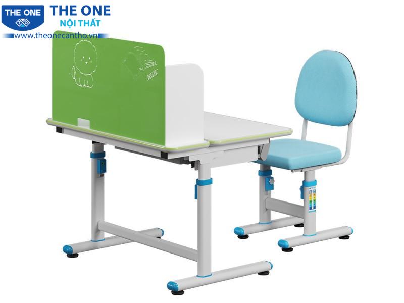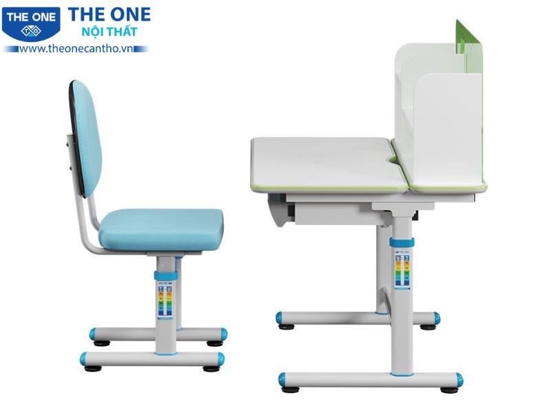Bộ bàn ghế học sinh khung thép sơn trắng gỗ M50 cạnh bàn dán nẹp 3D Bàn có ngăn kéo nhựa tiện dụng để đồ dùng học tập, phần giá sách gỗ kết hợp tấm hậu tôn sơn cùng màu nẹp mặt bàn. Bàn sử dụng cơ cấu tang chỉnh chiều cao bằng nẫy hãm. Đệm tựa ghế bọc vải hoa văn bắt mắt
