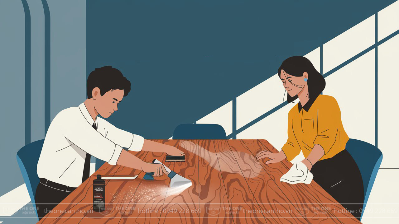 Vệ sinh bàn hội trường nên được thực hiện định kỳ để loại bỏ bụi bẩn và vi khuẩn. Sử dụng khăn mềm và nước ấm để lau chùi bề mặt bàn, tránh việc sử dụng hóa chất mạnh có thể làm hỏng bề mặt gỗ hoặc làm phai màu.