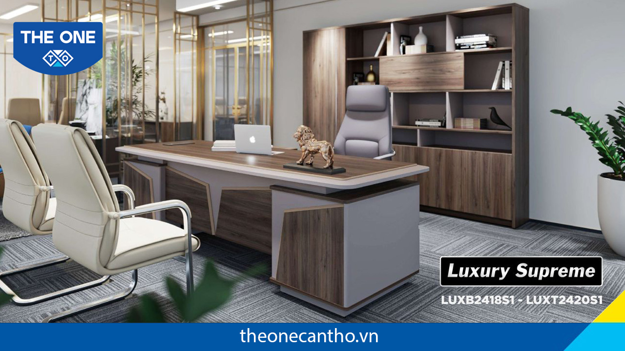 Bàn lãnh đạo Luxury Supreme LUXB2418S2: Thiết kế đẳng cấp với chất liệu gỗ tự nhiên cao cấp, đường nét tinh xảo, phù hợp với các văn phòng sang trọng của lãnh đạo cấp cao.