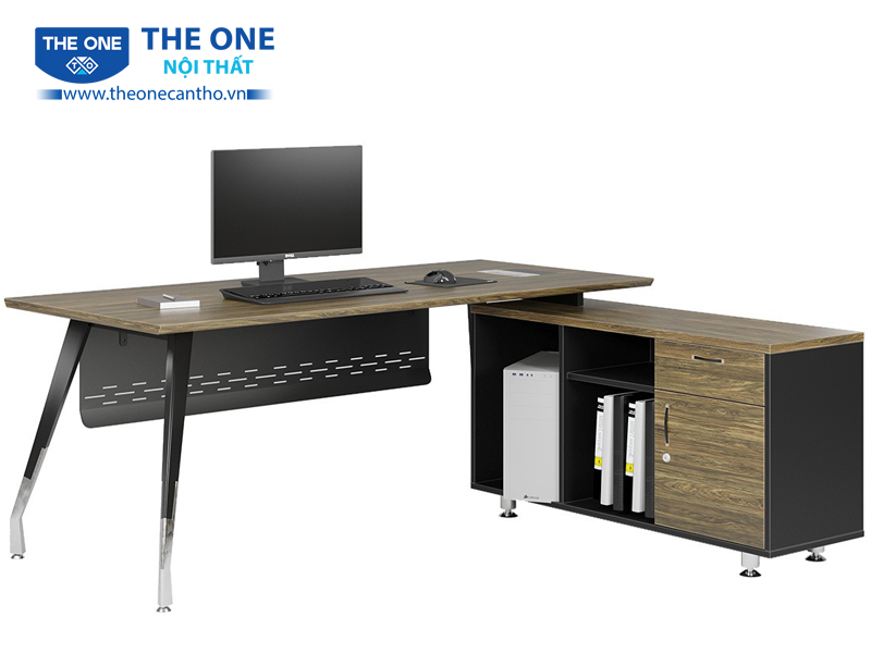 Mặt bàn được thiết kế tinh tế, vát cạnh 45 độ, tạo cảm giác mềm mại và dễ chịu khi nhìn vào. Đặc biệt, hệ thống luồn dây điện thông minh giúp giữ cho không gian làm việc luôn gọn gàng và ngăn nắp. Khả năng lưu trữ tài liệu cũng được chú trọng với tủ phụ đi kèm, giúp người dùng dễ dàng quản lý hồ sơ, giấy tờ mà không mất nhiều thời gian.