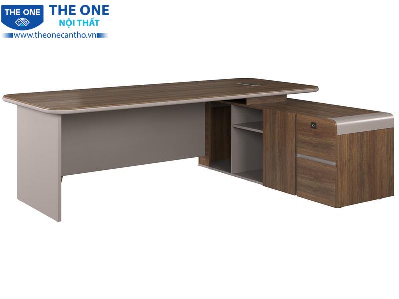 Tủ phụ liền bàn với khoang ngăn kéo và cánh mở giúp lưu trữ tài liệu một cách gọn gàng và dễ dàng tiếp cận. Yếm bàn được ốp song chỉ cầu lõm, tạo thêm chiều sâu cho thiết kế. Đặc biệt, mặt bàn còn có nắp đi dây hiện đại, giúp quản lý các thiết bị điện tử một cách gọn gàng và khoa học.
