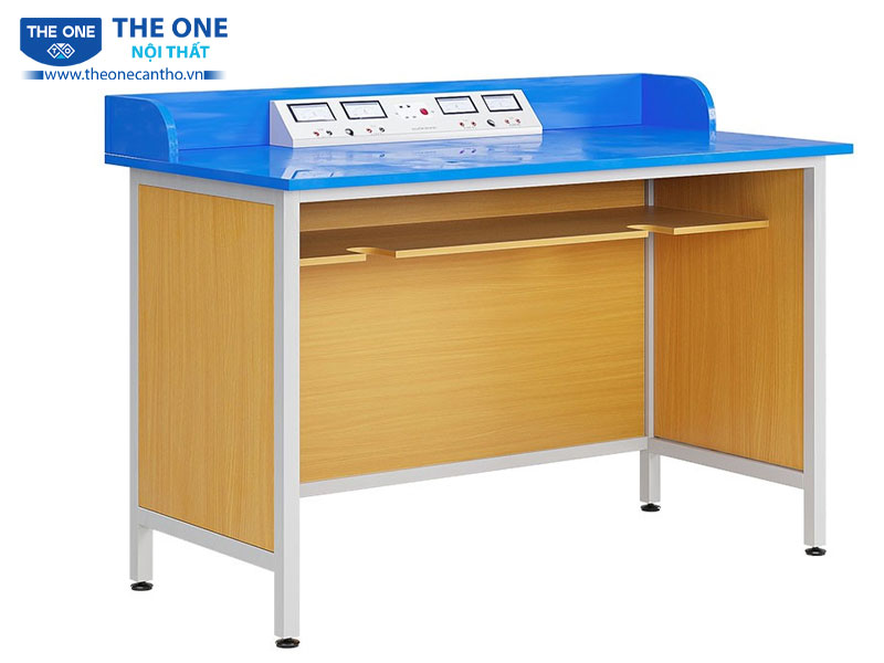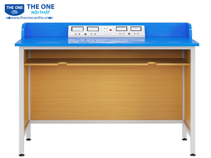 Bàn thí nghiệm vật lý 2 chỗ ,khung thép sơn tĩnh điện. Mặt bàn composite cách điện có độ bên cơ học cao, kết hợp ốp vách gỗ melamine. Bàn có 01 hộp điện tích hợp đồng hồ đo ampeke + Vol kế AC và DC kèm ổ cắm điện tiện dụng.
