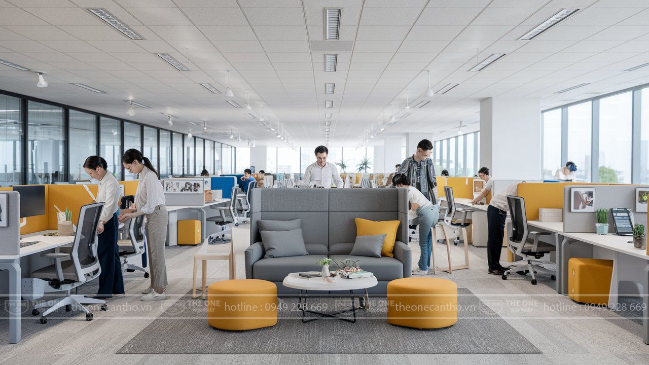Khuyến khích giao tiếp: Thiết kế mở giúp nhân viên dễ dàng trao đổi, thảo luận công việc, tăng cường sự hợp tác trong nhóm.