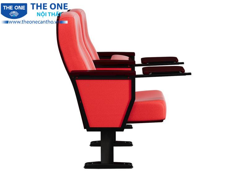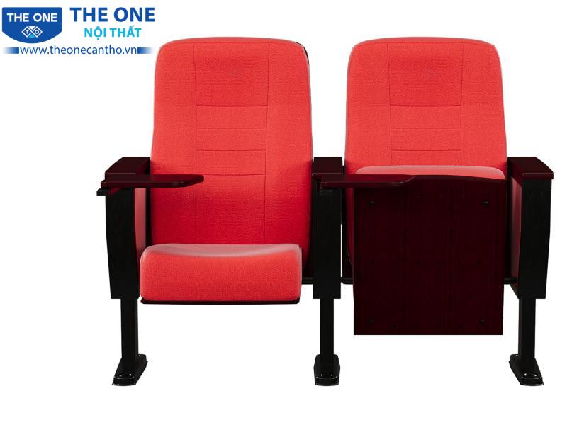 Ghế hội trường khung thép, đệm tựa mút đúc bọc vải, ốp đệm tựa gỗ. có cơ cấu giảm chấn đệm