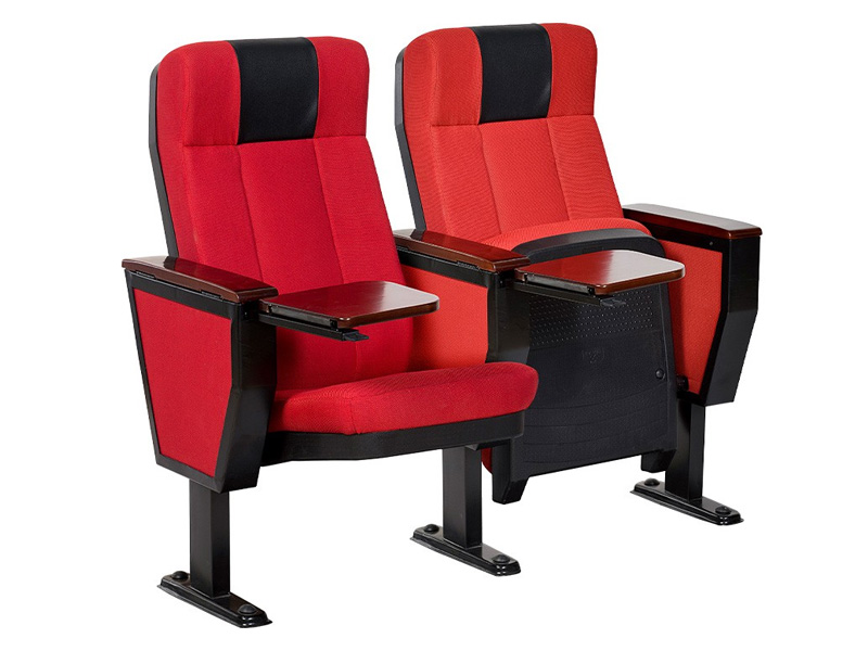 Ghế hội trường cao cấp khung thép, đệm tựa ghế bằng mút đúc bọc vải và dùng ốp đệm tựa bằng nhựa.