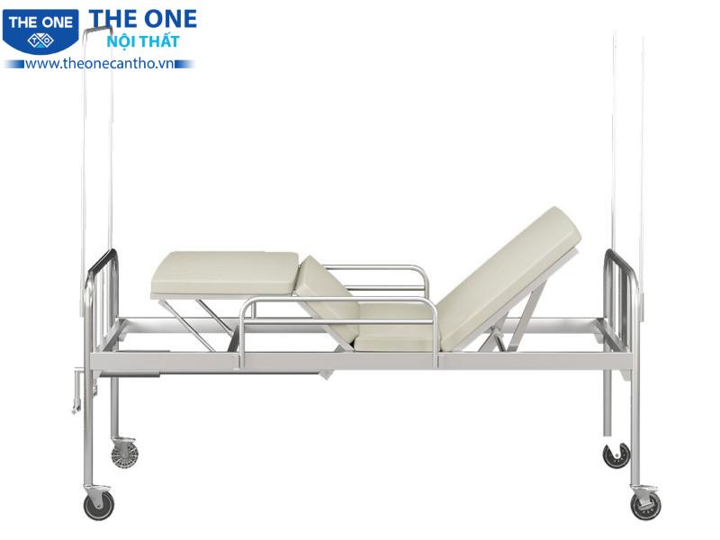 Giường y tế khung Inox, phần đầu giường và chân giường có thể nâng hạbằng 02 cơ cấu tay quay, chân có bánh xe.