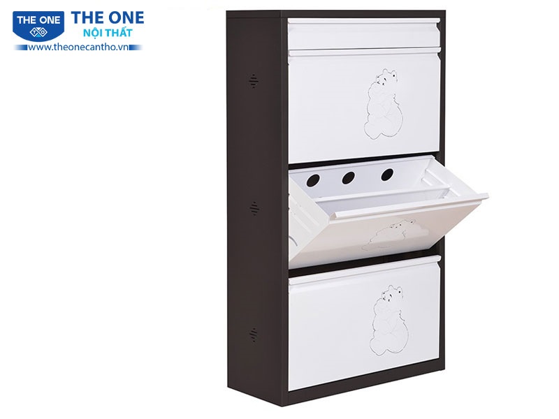 Tủ để giày có 3 ngăn lật & 1 ngăn kéo. Bên trong mỗi ngăn lật có 1 đợt di động chia hai tầng để giày.
