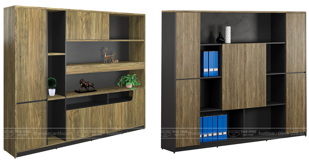 Thiết kế thông minh: Phần dưới là tủ đóng để lưu trữ tài liệu, phần trên là kệ mở để trưng bày vật phẩm, tạo nên sự cân bằng và hài hòa.