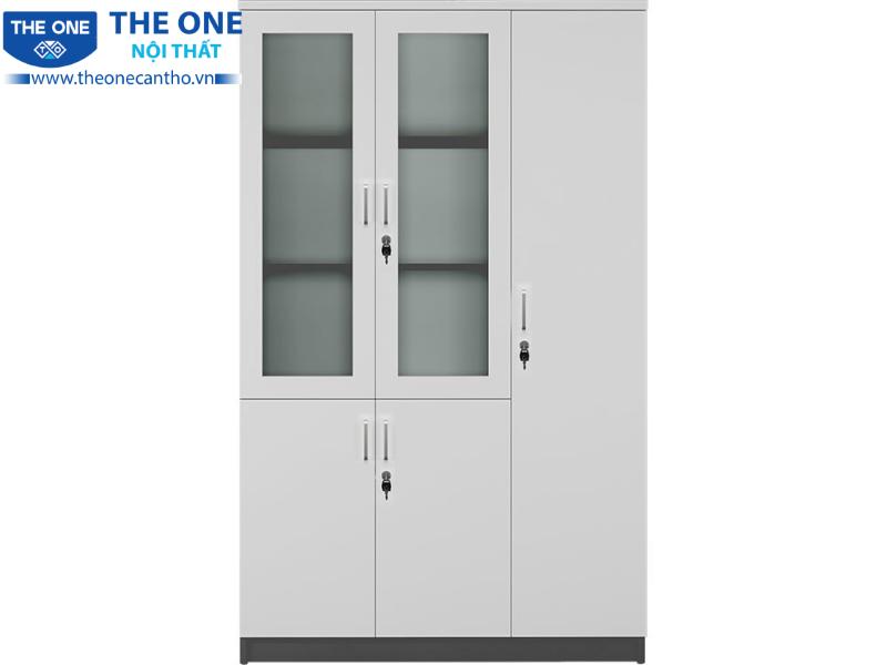 Sản phẩm được thiết kế với 3 khoang riêng biệt, kết hợp hài hòa giữa cánh kính và cánh gỗ, vừa tạo tính thẩm mỹ cao vừa đảm bảo tính năng lưu trữ đa dạng. Phần trên với cánh kính trong suốt cho phép trưng bày các tài liệu quan trọng, sách, giải thưởng hoặc vật phẩm trang trí, trong khi phần dưới với cánh gỗ kín đáo giúp bảo quản an toàn các tài liệu cần được bảo mật.